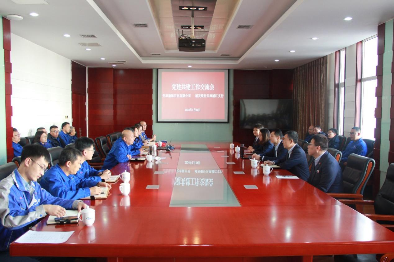 1月24日下午,天津渤海石化有限公司與浦發(fā)銀行天津浦江支行開展了黨建共建工作交流活動。渤海石化黨委書記、董事長郭子敬,黨委副書記、工會主席李建義,總會計師李薇,浦江支行黨支部書記、行長趙博,副行長于金普及雙方黨員代表參加了此次活動。