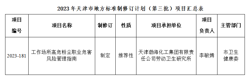 近日,2023年天津市地方標準制修訂計劃(第三批)發布,天津渤海化工集團有限責任公司勞動衛生研究所承擔的《工作場所高危粉塵職業危害風險管理指南》獲批天津市立項。