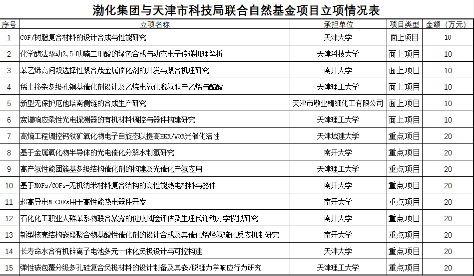 經(jīng)過指南征集發(fā)布、項(xiàng)目申報(bào)、專家評(píng)審及市科技局審核等程序,市科技局已完成2025年天津市自然科學(xué)基金聯(lián)合基金第二批擬立項(xiàng)項(xiàng)目的公示工作。本次將立項(xiàng)支持15個(gè)綠色化工項(xiàng)目,包括面上項(xiàng)目6項(xiàng)和重點(diǎn)項(xiàng)目9項(xiàng),共集聚了天津大學(xué)、南開大學(xué)、天津科技大學(xué)、天津理工大學(xué)和天津城建大學(xué)5所高校的科研力量。