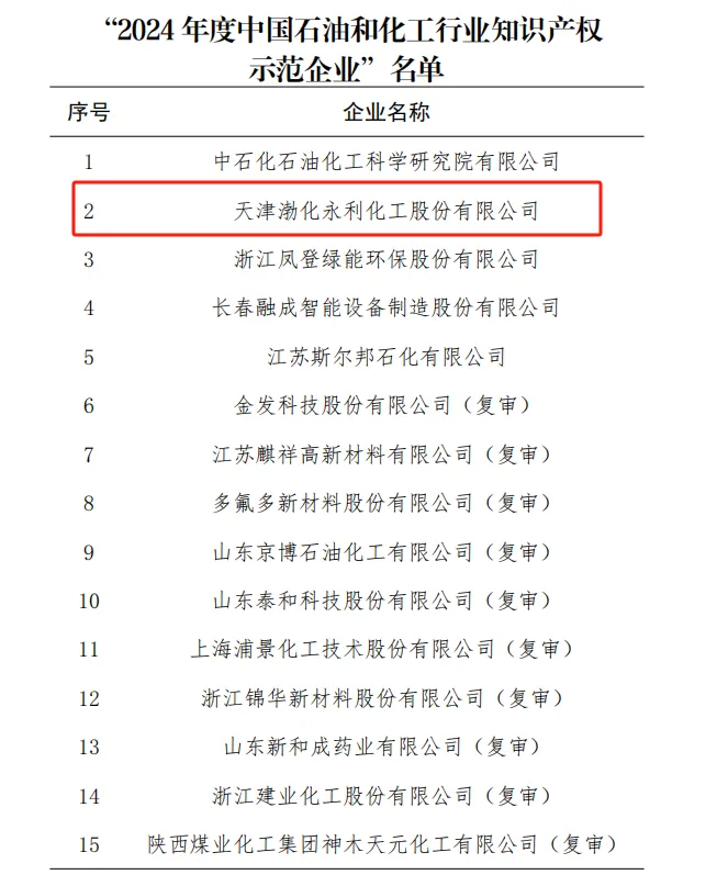 日前,中國石油和化學工業聯合會正式公布了《關于認定2024年度中國石油和化工行業知識產權示范企業的決定》,天津渤化永利化工股份有限公司成功入選,成為2024年度全國15家獲此殊榮的企業之一。