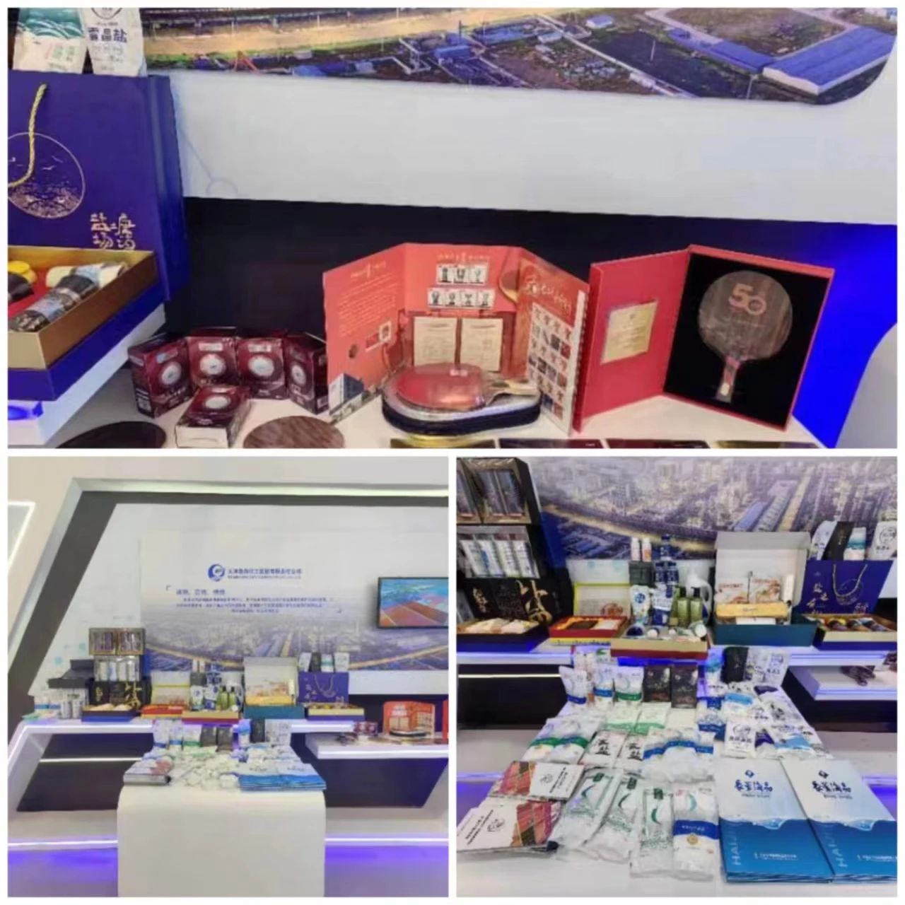 本次活動集團在天津?qū)嶓w館中布展,以“圖片+視頻+實物+場景搭建”為手段,結(jié)合新型多媒體技術(shù)和現(xiàn)場活動,集中展示了渤化集團自主品牌的發(fā)展創(chuàng)新成就。主要參展展品包括729公司球拍、套膠等體育用品;漢沽鹽場的食用鹽系列、海鹽洗護系列、小肽系列、鹽之灸;海晶集團的塑封產(chǎn)品、氟化工等集團特色產(chǎn)品。